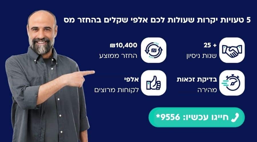 לעומת עמלה של 16-18% על ההחזר, ההפסד מהגשה עצמאית יכול להגיע ל-40-60% מההחזר הפוטנציאלי. במילים אחרות: במקום לחסוך עמלה, אתם מפסידים פי כמה מהסכום שניסיתם לחסוך.